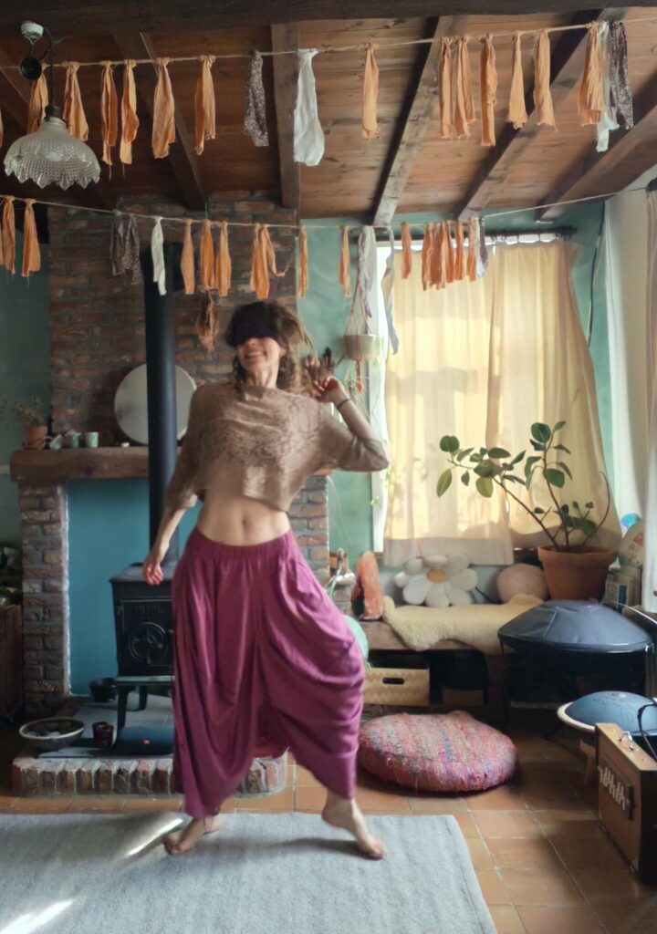 Geblinddoekt beweeg je op ritmische muziek. De blinddoek is geen beperking, maar een uitnodiging: ze brengt je volledig bij jezelf, weg van buitenaf, diep naar binnen. Vanuit die toestand van innerlijke stilte en beweging ontstaat er ruimte voor heling, inzicht en vernieuwing.